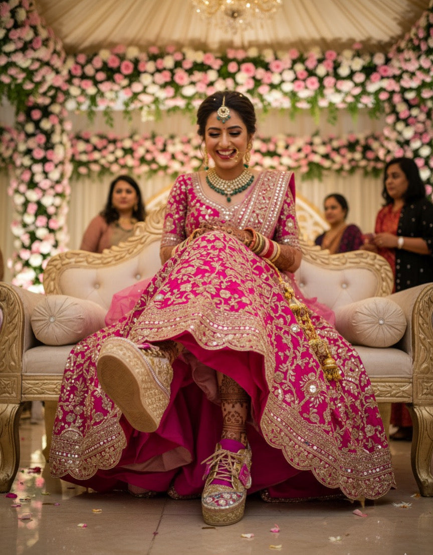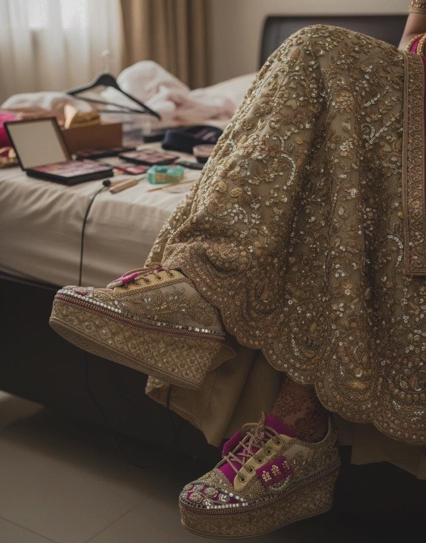 Step into your wedding celebrations with a perfect blend of luxury, comfort, and tradition. These handcrafted heeled platform sneakers are adorned with intricate zardozi, pearls, sequins, and mirror work, making them a true statement piece for the modern bride.