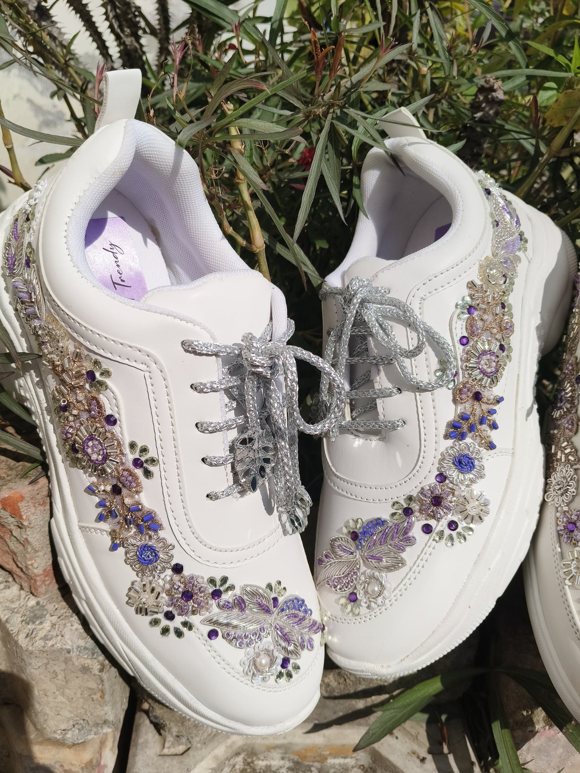 Funky N Trendy embroidery work bridal sneakers/ bridesmaid sneaker / silver sneakers/ purple shoes /name and wedding date customization