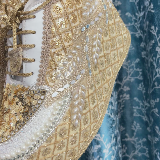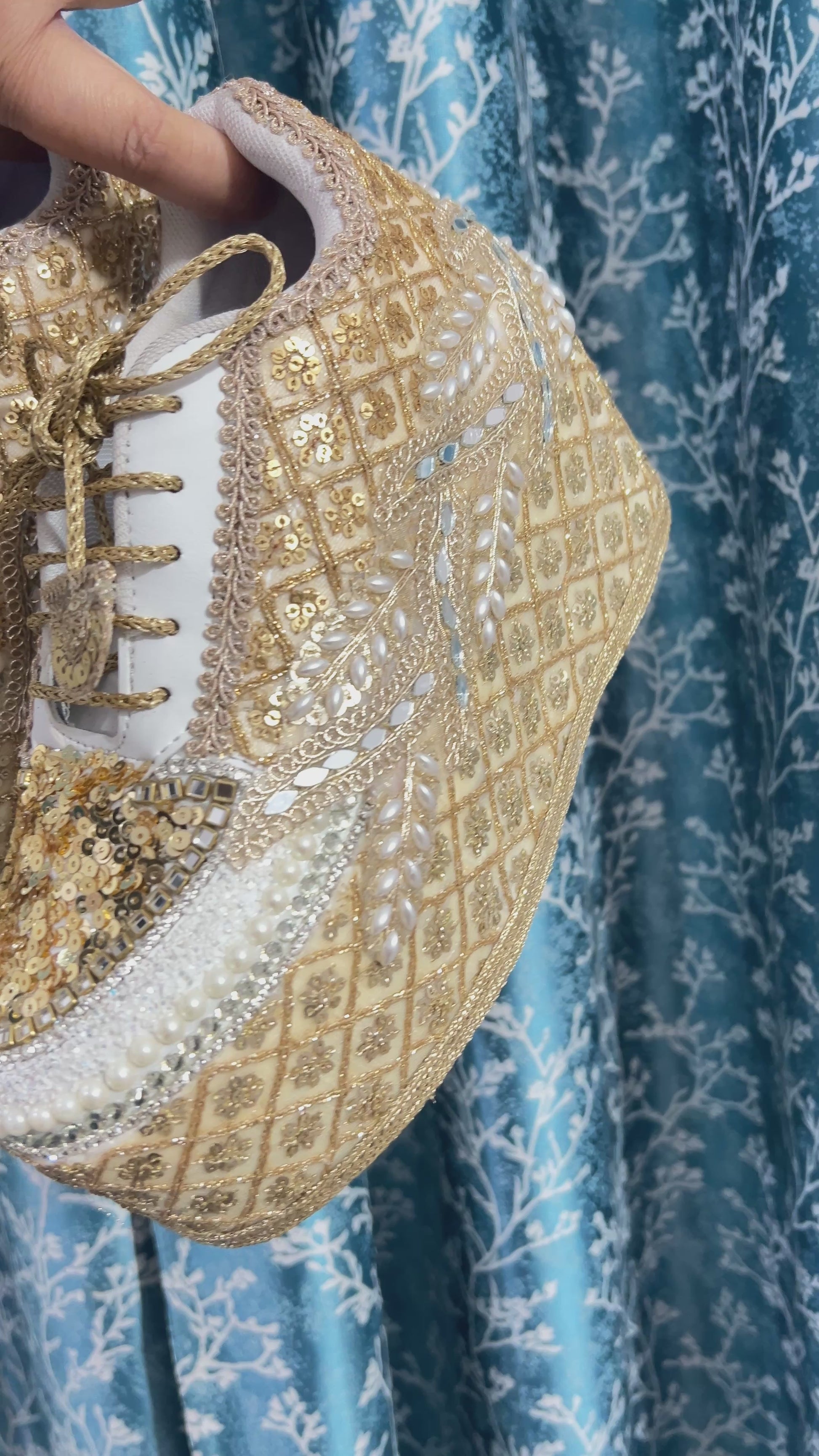 Step into your wedding celebrations with a perfect blend of luxury, comfort, and tradition. These handcrafted heeled platform sneakers are adorned with intricate zardozi, pearls, sequins, and mirror work, making them a true statement piece for the modern bride.