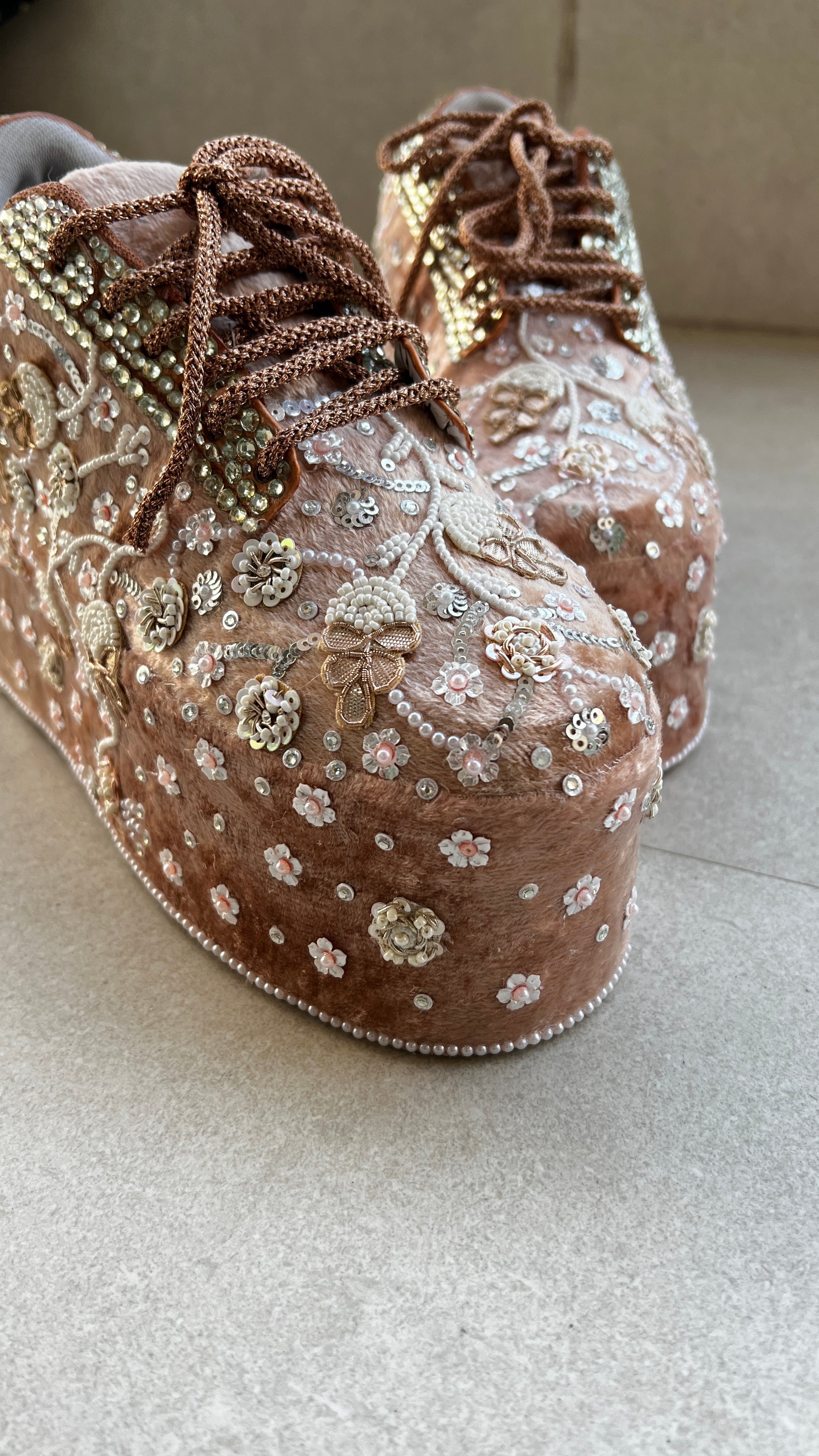 FUNKY N TRENDY rose gold with pearl Embroidered bridal sneakers - wedge sneakers heeled sneakers/ pearl work sneakers