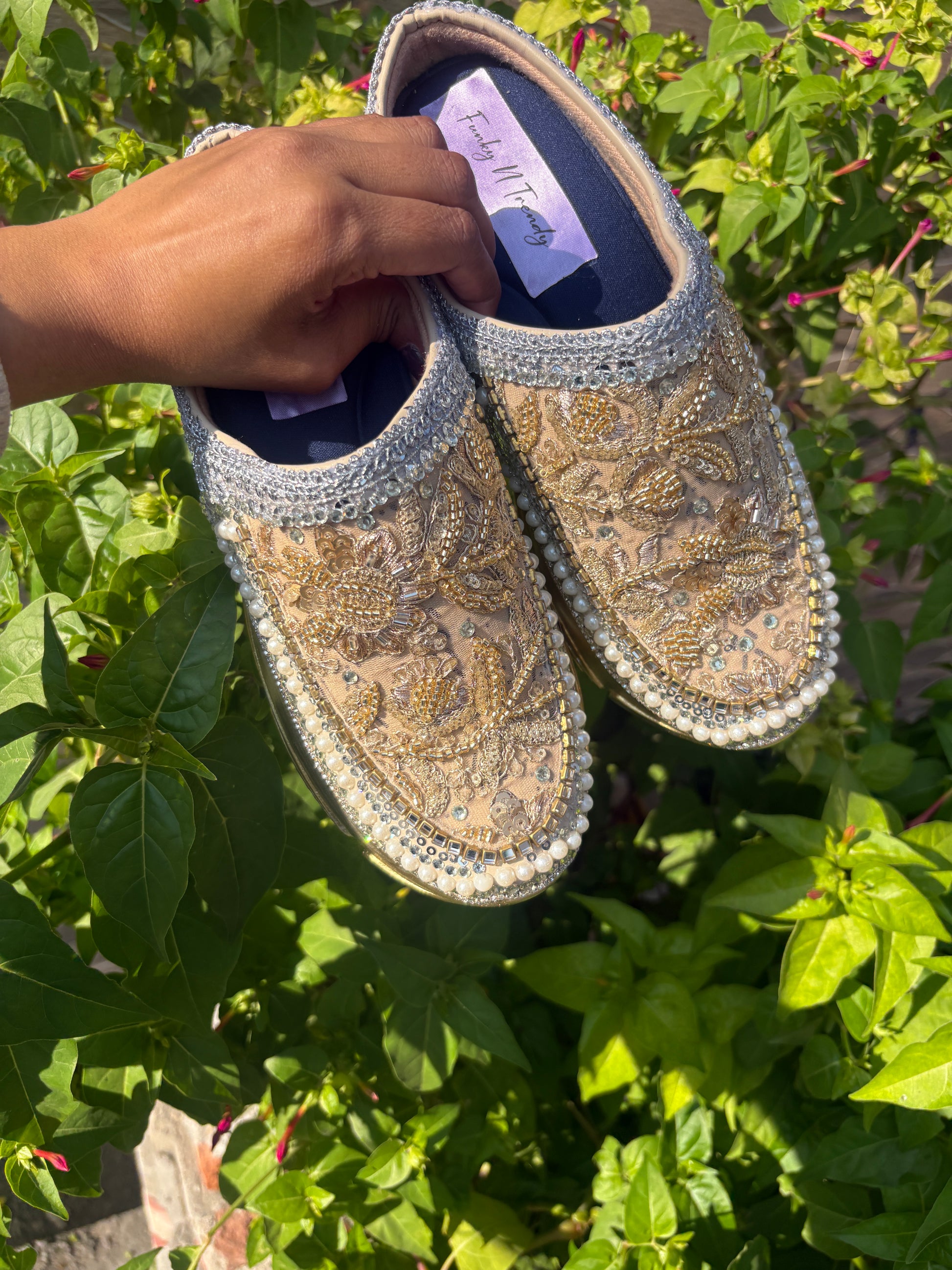 Funky N Trendy hand crafted golden bridal sneakers bridesmaid sneakers/ mom shoes / half shoes / golden sneakers / embroidered half shoes