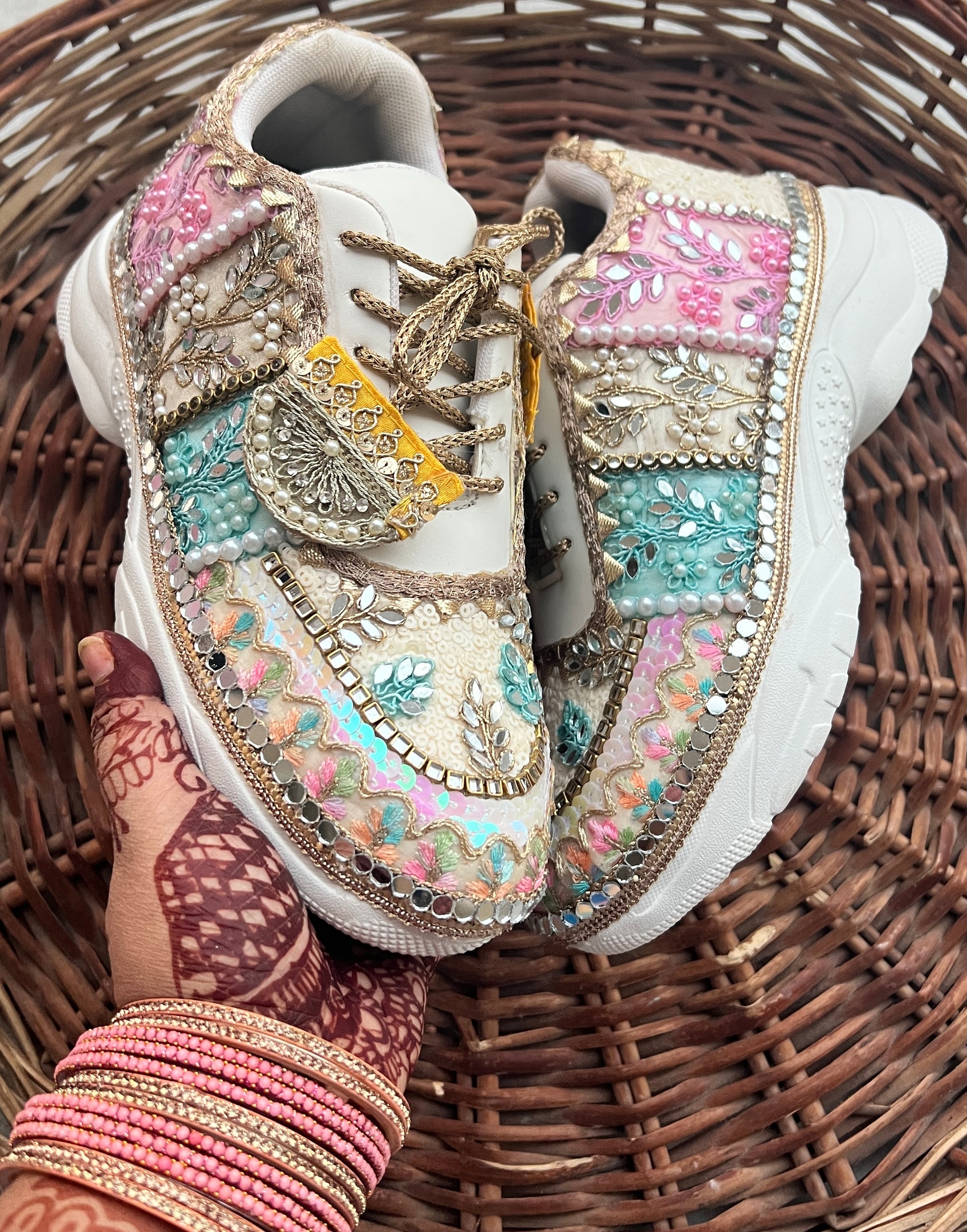 FUNKY N TRENDY hand crafted pastel bridal sneakers / gold sneakers / pastel sneakers / embroidery sneakers / sneakers for bride/ bridal shoes / multi colored shoes / pastel shades / ivory with pastel colors/ embroidery shoes