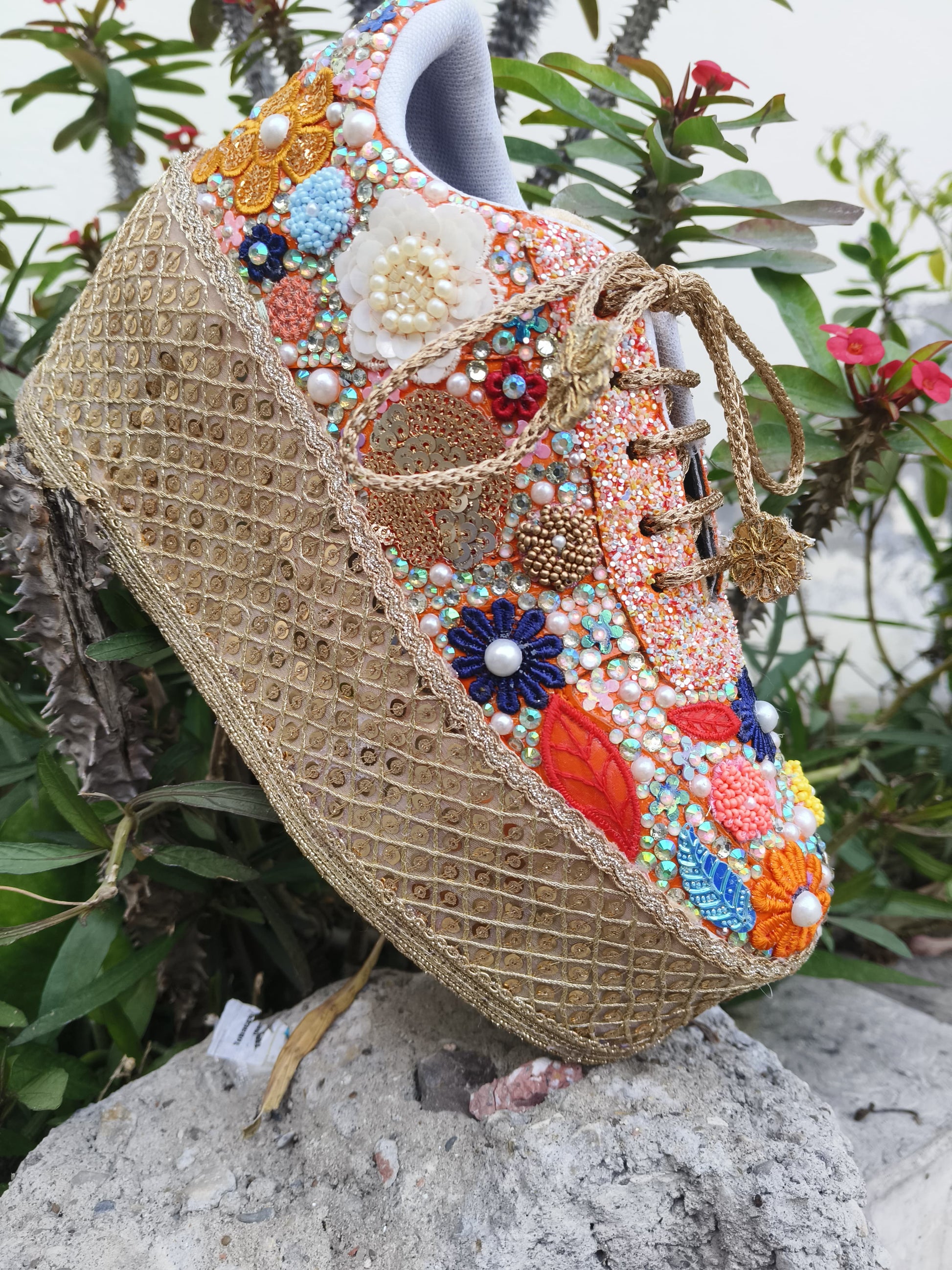 FUNKY N TRENDY Hand embroidered floral theme sneakers - wedge sneakers heeled sneakers/multi colored sneakers