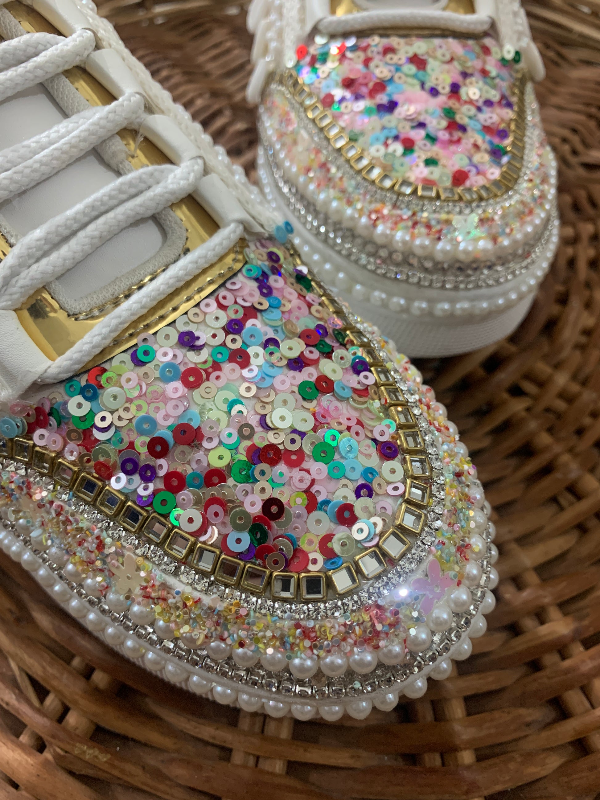 FUNKY N TRENDY ivory sneakers with multi colored detailing for brides /bridesmaids / sneakers for bridesmaids/ handcrafted sneakers/ sequine sneakers / bridal sneakers / bridesmaid sneakers/ ivory sneakers / shell shoes