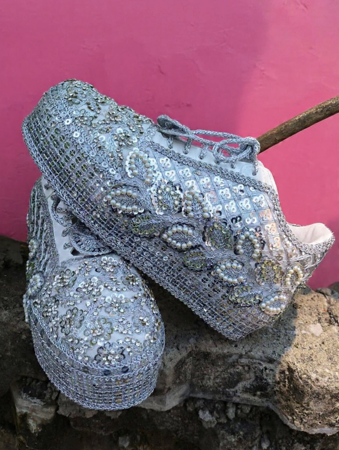 Step into the spotlight with our Silver Mirror High Heel Wedge Sneakers — where comfort meets couture. Handcrafted to perfection, these glam wedges reflect every light, every beat, and every gaze on your Sangeet, Reception, or Cocktail night.