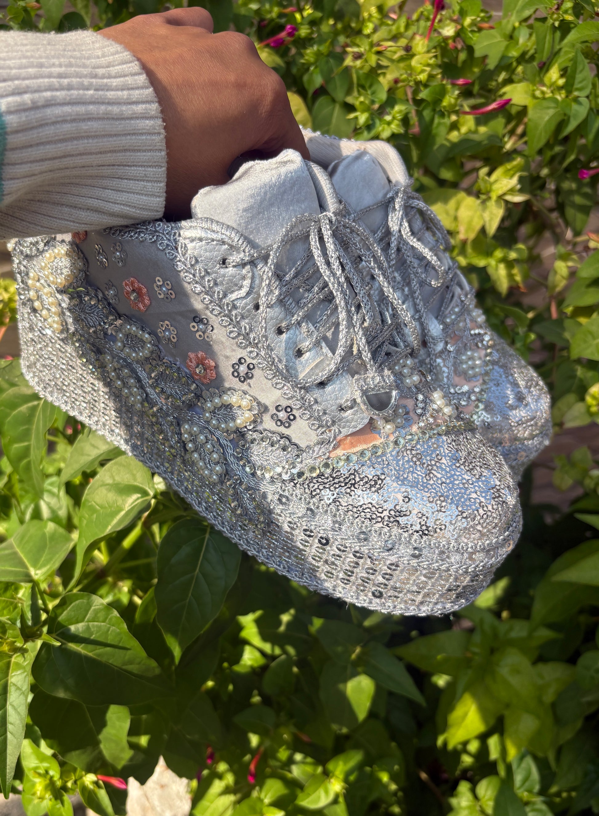 Step into the spotlight with our Silver Mirror High Heel Wedge Sneakers — where comfort meets couture. Handcrafted to perfection, these glam wedges reflect every light, every beat, and every gaze on your Sangeet, Reception, or Cocktail night.
