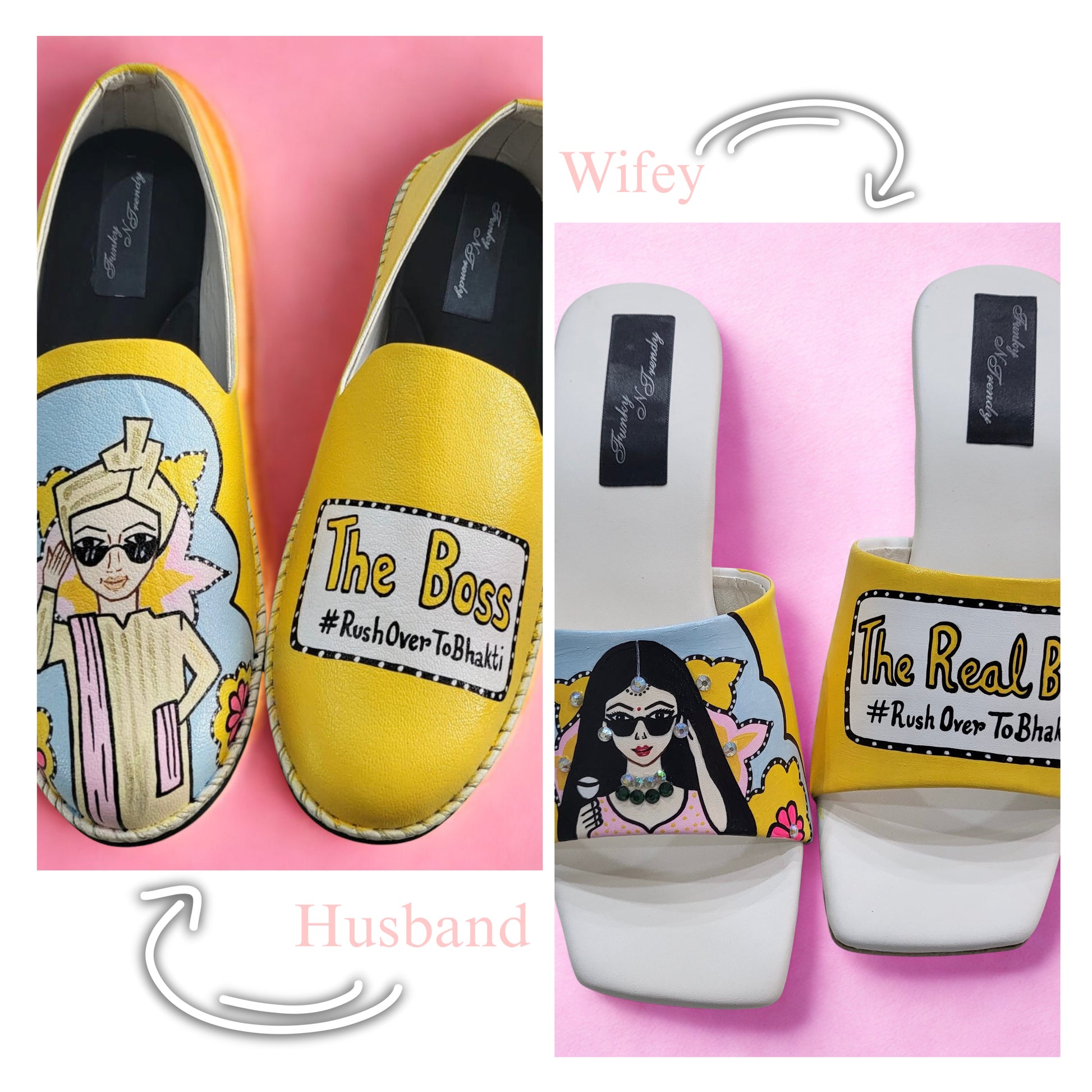 Funky N Trendy Couple footwear/ bridal footwear / groom footwear/ quirky footwear / couple shoes/funky bridal combos / wedding footwear/ couple footwear for haldi mahendi sangeet/hand painted heels/ wedges / yellow shoes for haldi
