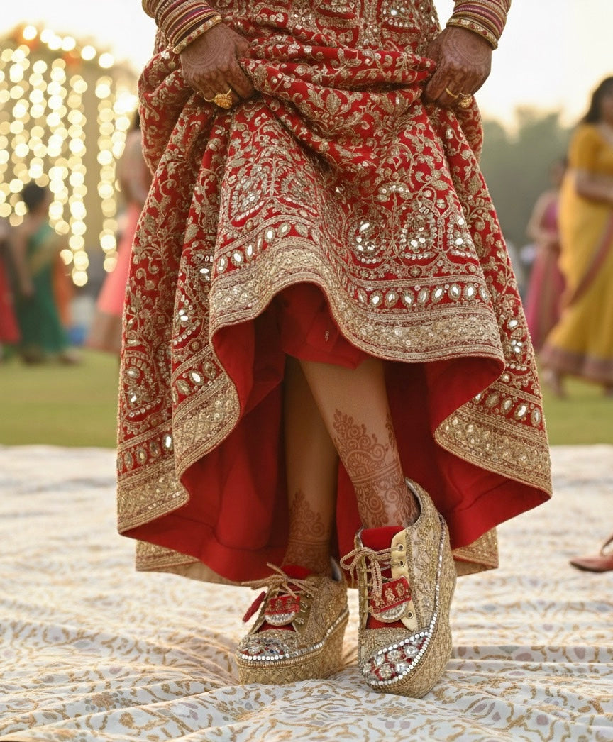 Step into your wedding celebrations with a perfect blend of luxury, comfort, and tradition. These handcrafted 4.5-inch platform sneakers are adorned with intricate zardozi, pearls, sequins, and mirror work, making them a true statement piece for the modern bride.